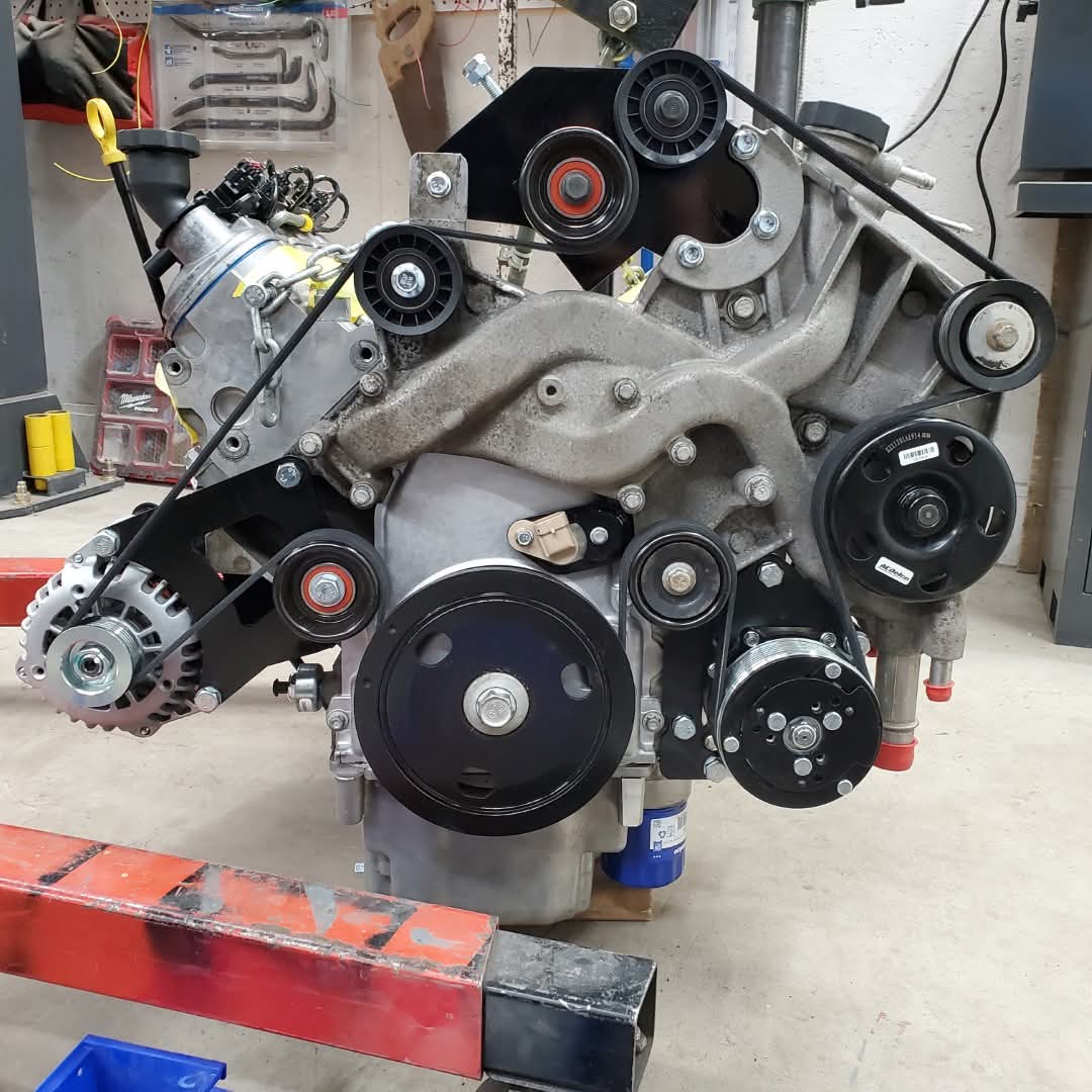 An accessory drive setup for the LS4 optimized for use in the DeLorean. Removes the Power Steering pump, clunky tensioner, and allows use of a A/C compressor directly compatible with the DeLorean A/C system. Accessories are mounted low for a "cleaner" engine bay.