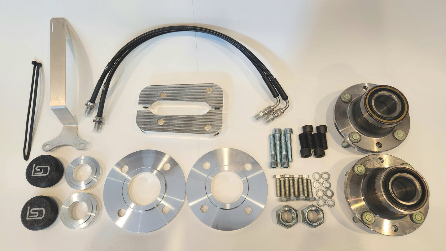 - Brackets, spacers, hubs/bearings, dust caps, hub-centric spacer, brake lines, hardware, and instructions.